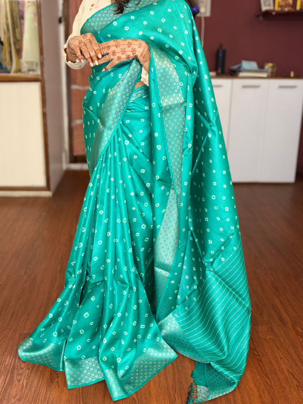 Discover the elegance of our Pure Tussar Bandhani Saree at Anshul Creations. This exquisite saree, measuring 5.5 meters, is a luxurious fusion of Chattisgarh Tussar silk with the intricate Bandhani craftsmanship of Rajasthan, ensuring a unique and enchanting design. Accompanied by a 1-meter blouse piece, it offers both style and comfort for any occasion. Proudly Silk Mark certified, our saree guarantees authenticity and premium quality. Elevate your wardrobe with the timeless beauty of tradition and artistry.