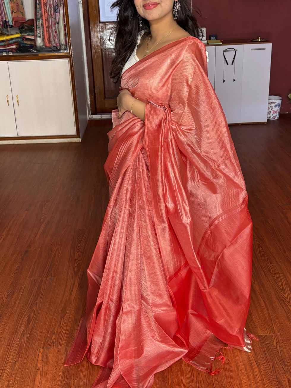 Experience the timeless elegance of our Tussar Organza Silk Saree. This exquisite saree, with a generous 5.5-meter length and a matching 1-meter blouse piece, is a testament to traditional craftsmanship and refined luxury. Perfect for any grand occasion, its delicate organza tissue silk fabric ensures a graceful drape. For longevity and preservation of its pristine condition, we recommend dry wash only.
